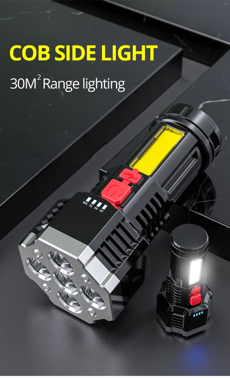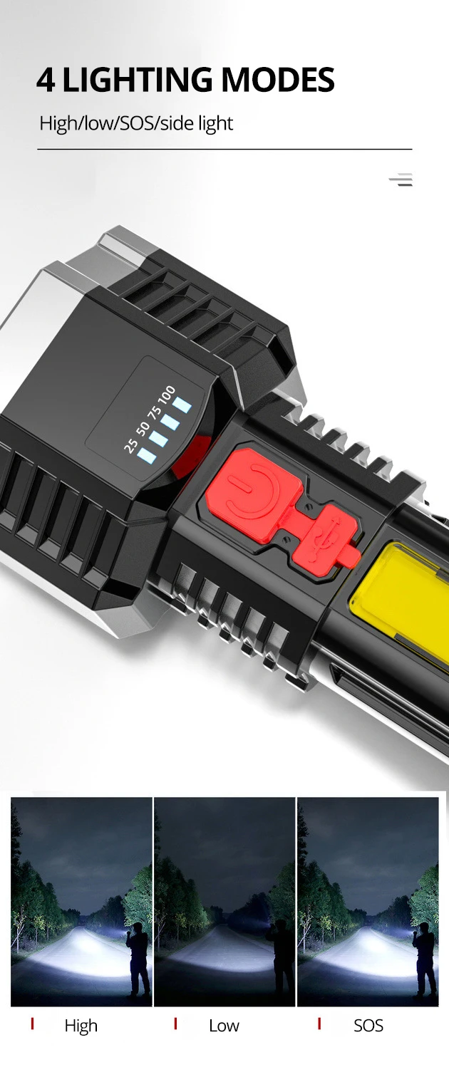 Using high-quality synthetic plastic, durable, hard, not easy to damage, and light weight, the front 7 LED lamp beads, the brightness is extremely high, easy to illuminate about 100 meters. Equipped with a COB side light, which can be used as a flood light.